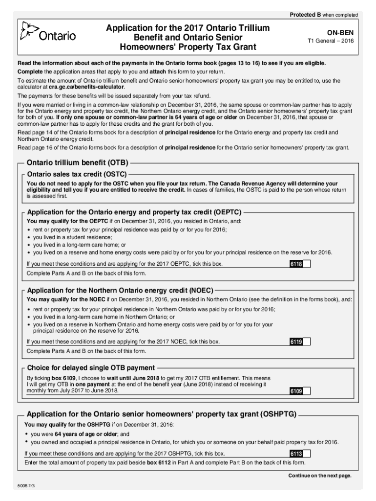 5006-TG T1 General 2016 — ON-BEN Application for the 2017 Ontario Trillium Benefit and the Ontario Senior Homeowners\' Property Tax Grant. Choose a blank template from the list and complete it instantly.