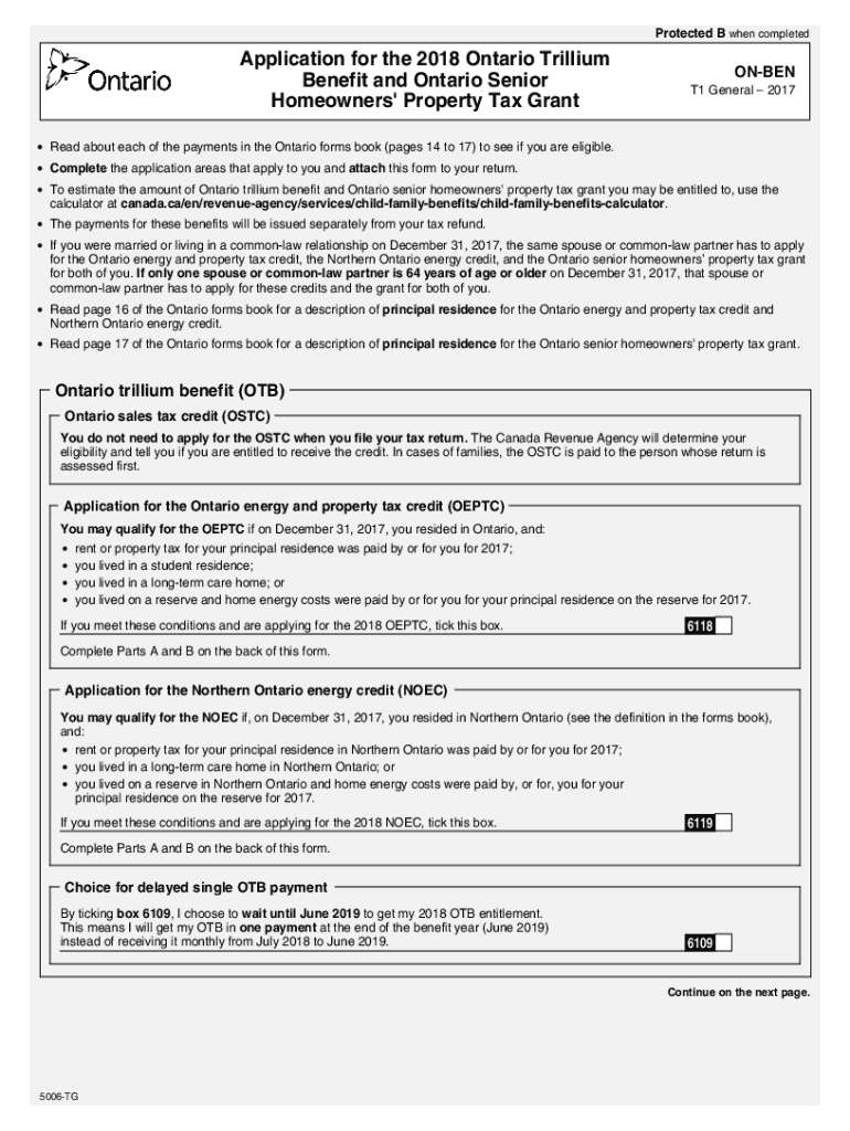 5006-TG T1 General 2017 — ON-BEN Application for the 2018 Ontario Trillium Benefit and the Ontario Senior Homeowners\' Property Tax Grant. Choose a blank template from the list and complete it instantly.