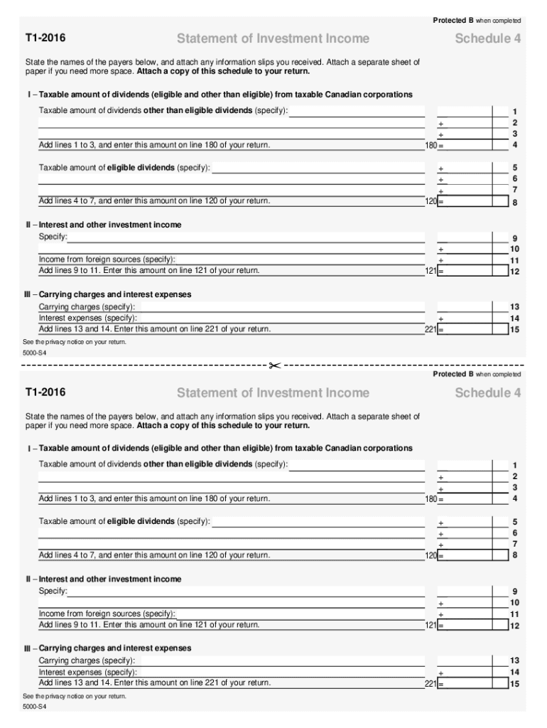 5000-S4 T1 General 2016 — Schedule 4 — Statement of Investment Income — Common to all — Non-residents and deemed residents of Canada. Choose a blank template from the list and complete it