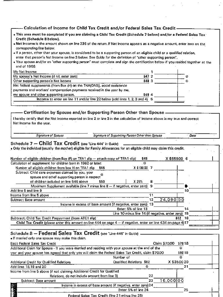 5006-S7 Schedule 7 — Ontario — T1 General 1988 — Calculation of income for child tax credit and/or federal sales tax credit. Choose a blank template from the list and complete it instantly.