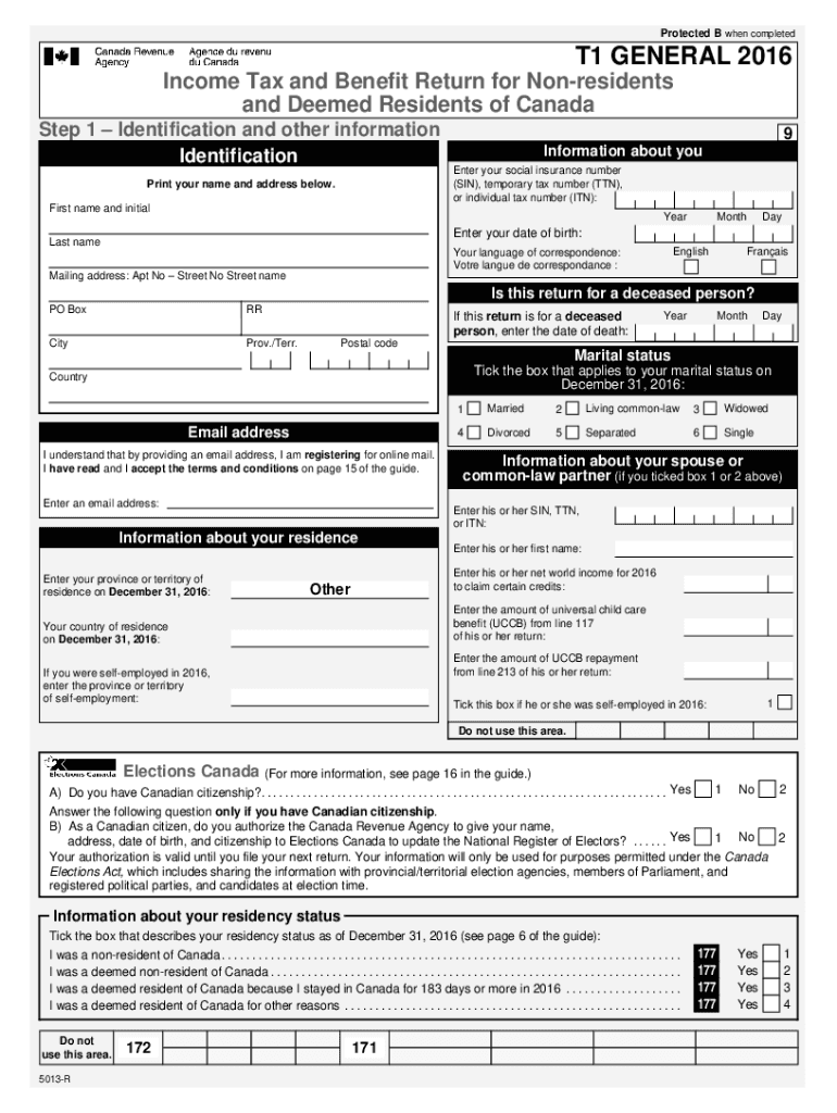 5013-R T1 General 2016 — Income Tax and Benefit Return for Non-Residents and Deemed Residents of Canada. Choose a blank template from the list and complete it instantly. Try now!