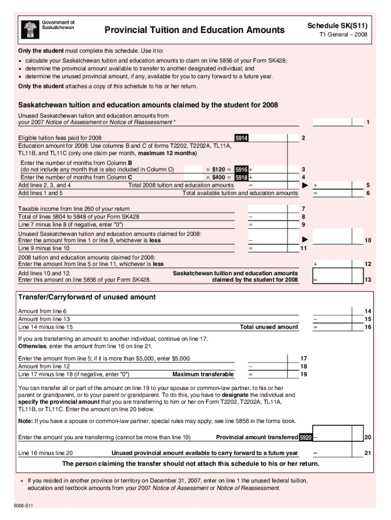5008-S11 Schedule SK(S11) — Provincial Tuition and Education Amounts — T1 General 2008 — Saskatchewan. Choose a blank template from the list and complete it instantly. Try now!