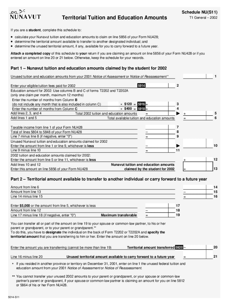 5014-S11 Schedule NU (S11) — Territorial Tuition and Education Amounts — T1 General 2002 — Nunavut. Choose a blank template from the list and complete it instantly. Try now!