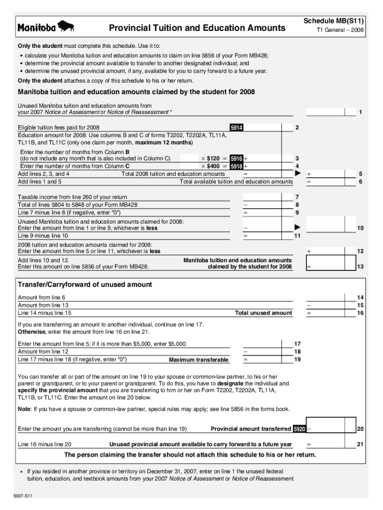5007-S11 Schedule MB(S11) — Provincial Tuition and Education Amounts — T1 General 2008 — Manitoba. Choose a blank template from the list and complete it instantly. Try now!