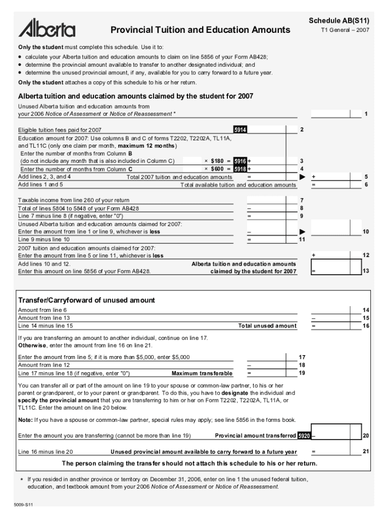 5009-S11 Schedule AB(S11) — Provincial Tuition and Education Amounts — T1 General 2007 — Alberta. Choose a blank template from the list and complete it instantly. Try now!