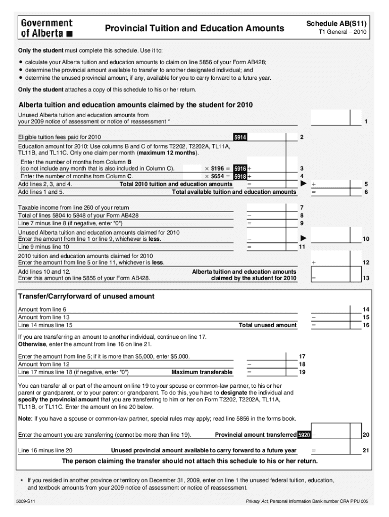 5009-S11 T1 General 2010 — Schedule AB(S11) — Provincial Tuition and Education Amounts — Alberta. Choose a blank template from the list and complete it instantly. Try now!