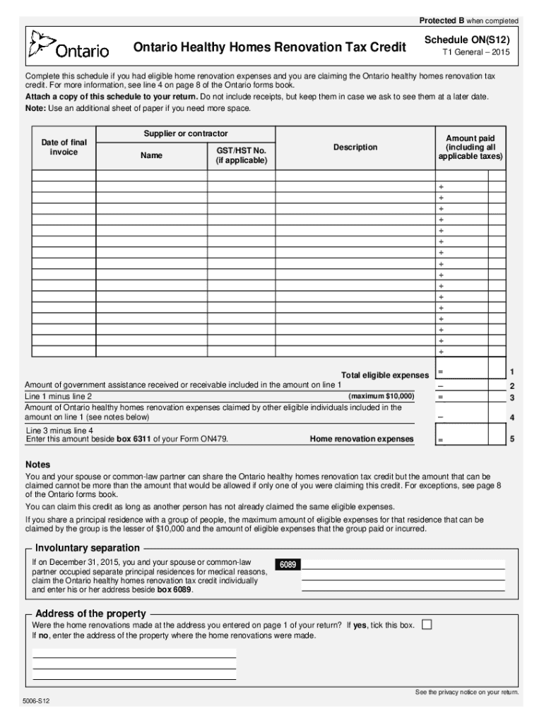 5006-S12 T1 General 2015 — Schedule ON(S12) — Ontario Healthy Homes Renovation Tax Credit. Choose a blank template from the list and complete it instantly. Try now!