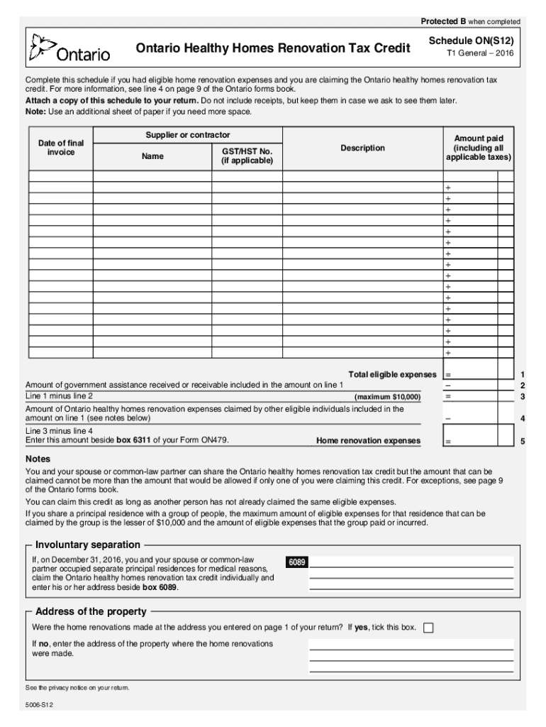 5006-S12 T1 General 2016 — Schedule ON(S12) — Ontario Healthy Homes Renovation Tax Credit. Choose a blank template from the list and complete it instantly. Try now!