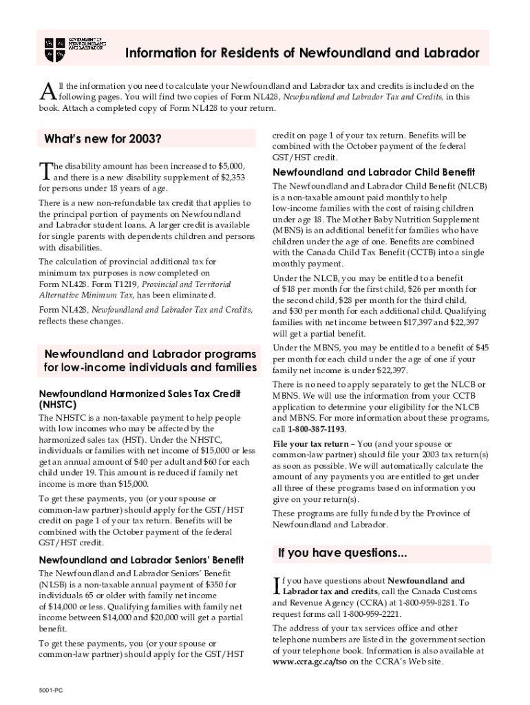 5001-PC Information for Residents of Newfoundland and Labrador — T1 General 2003. Choose a blank template from the list and complete it instantly. Try now!
