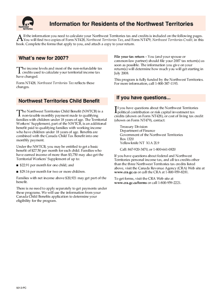5012-PC Information for residents of the Northwest Territories — T1 General 2007. Choose a blank template from the list and complete it instantly. Try now!