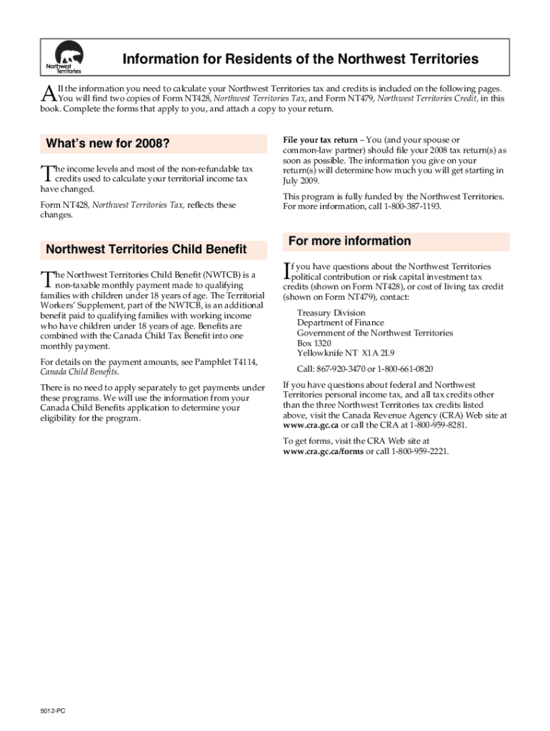 5012-PC Information for residents of the Northwest Territories — T1 General 2008. Choose a blank template from the list and complete it instantly. Try now!