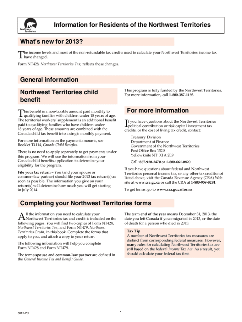 5012-PC T1 General 2013 — Information for Residents of the Northwest Territories. Choose a blank template from the list and complete it instantly. Try now!