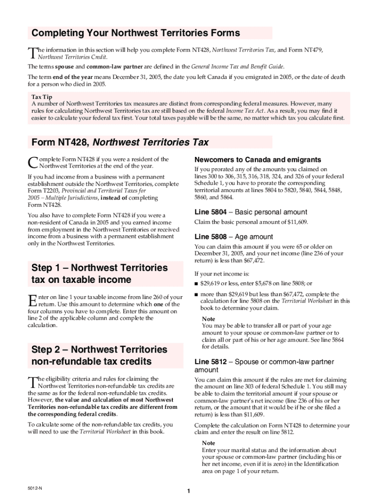 5012-N Completing Your Northwest Territories Forms — T1 General 2005. Choose a blank template from the list and complete it instantly. Try now!