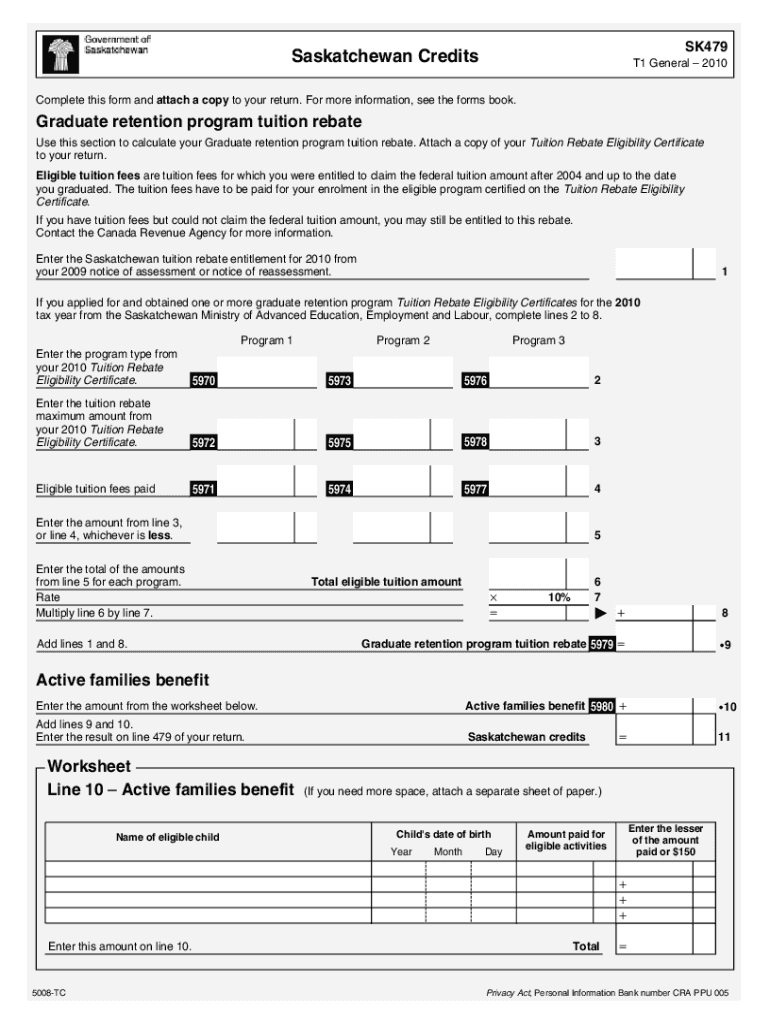 5008-TC T1 General 2010 — SK479 — Saskatchewan Credits filler. Choose a blank template from the list and complete it instantly. Try now!