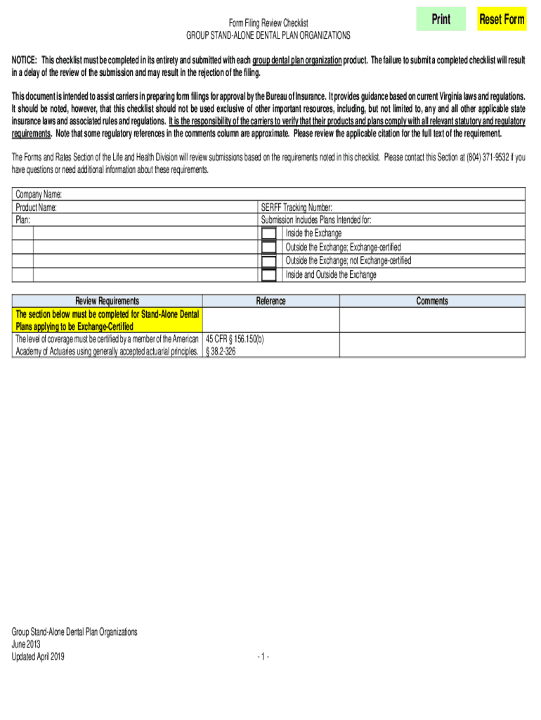 Form Filing Review Checklist GROUP STANDALONE DENTAL PLAN ORGANIZATIONSPrintReset Formative: This checklist must be completed in its entirety and submitted with each group dental plan organization
