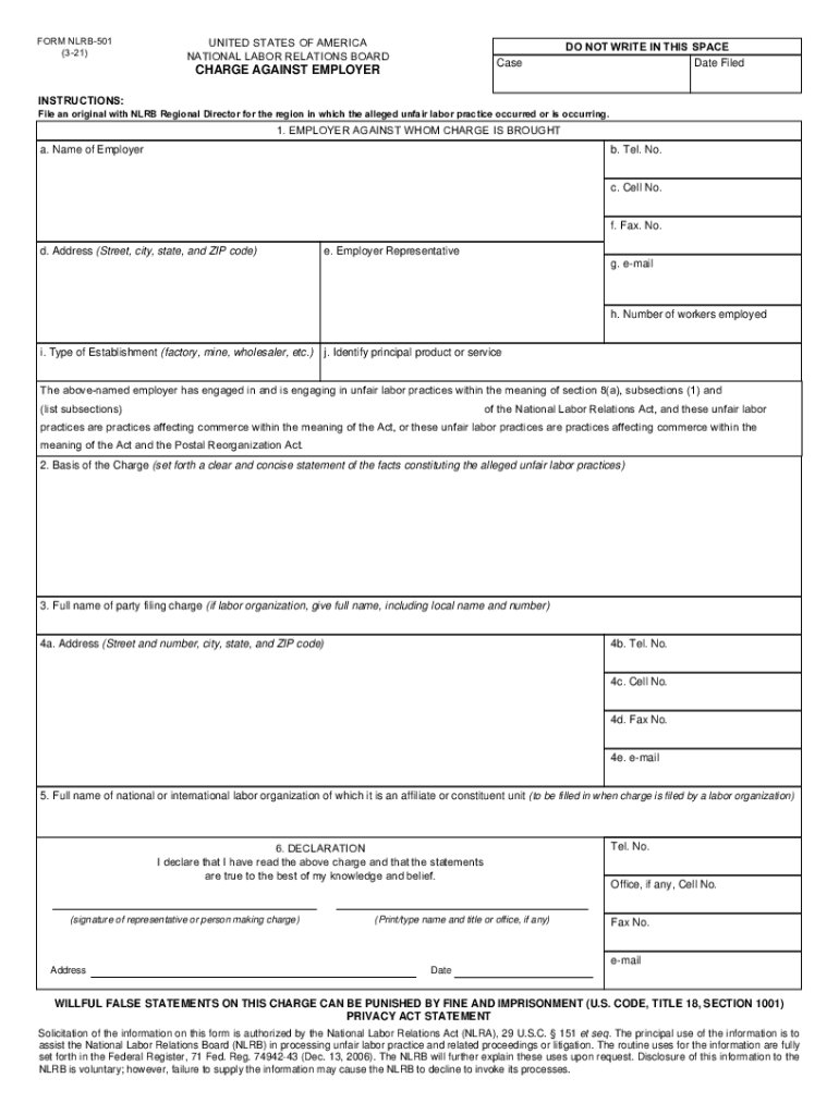 FORM NLRB501 (321)Please Review the Following Important Information Before Filling Out a Charge Form! Please call an Information Officer in the Regional Office nearest you for assistance in filing