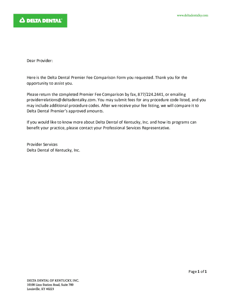 DearProvider:HereistheDeltaDentalPremierFeeComparisonFormyourequested. Thankyouforthe opportunitytoassistyou. PleasereturnthecompletedPremierFeeComparisonbyfax,877/224.2441,or emailing providerrelations@deltadentalky.com.