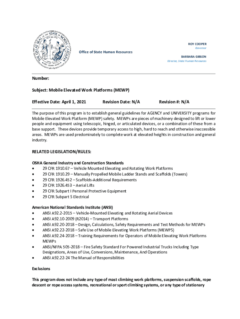 ROY COOPER GovernorOffice of State Human Resources BARBARA GIBSON Director, State Human ResourcesNumber: Subject: Mobile Elevated Work Platforms (MEW) Effective Date: April 1, 2021Revision Date: N/Revision