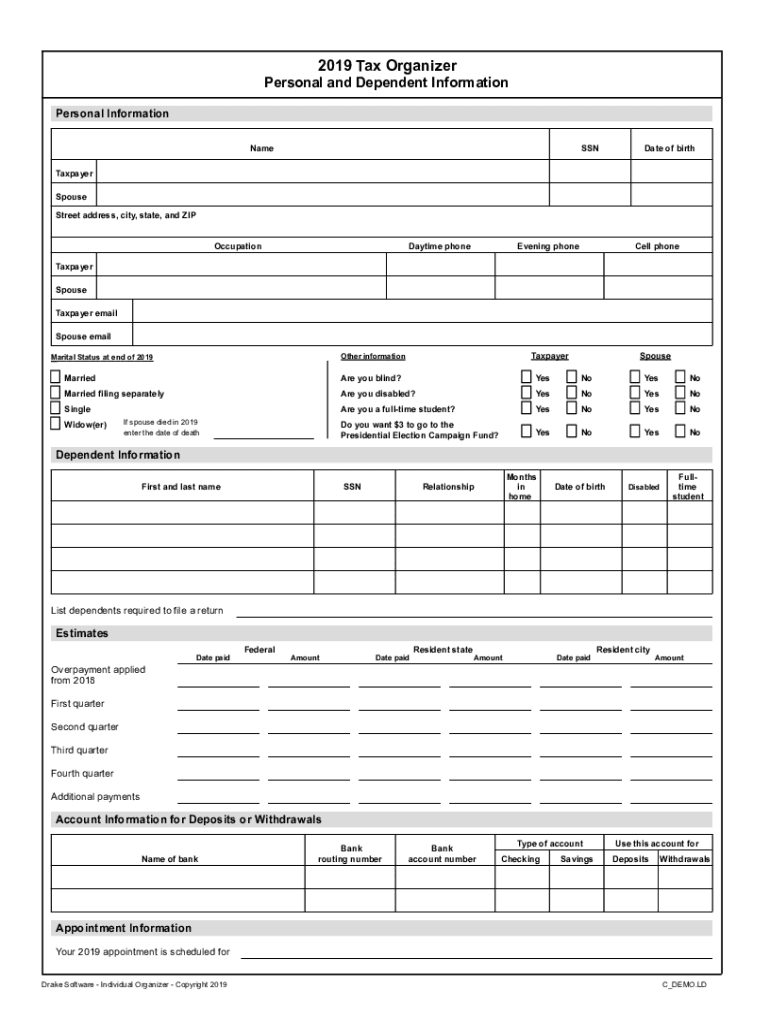 2019 Tax OrganizerPersonal and Dependent Information Personal Information NameSSNDate of birthTaxpayer Spouse Street address, city, state, and ZIP OccupationDaytime phoneEvening foretell phoneTaxpayerSpouseTaxpayer