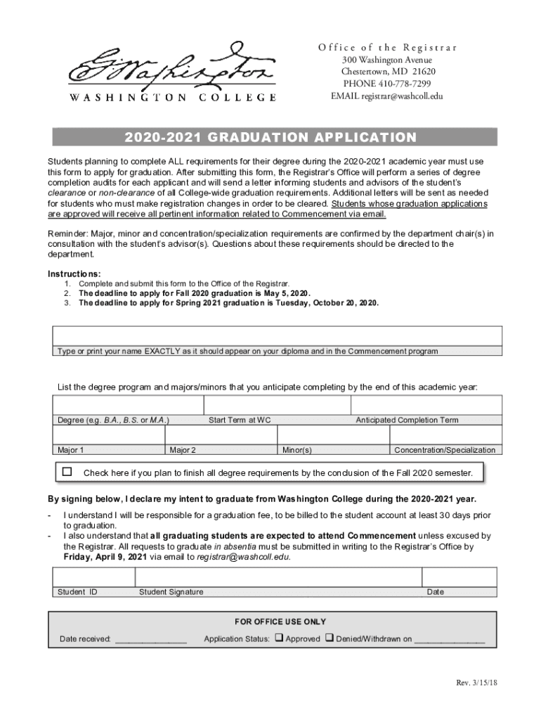 Office of the Registrar 300 Washington Avenue Chesterton, MD 21620 PHONE 4107787299 EMAIL registrar@washcoll.edu20202021 GRADUATION APPLICATION Students planning to complete ALL requirements for their