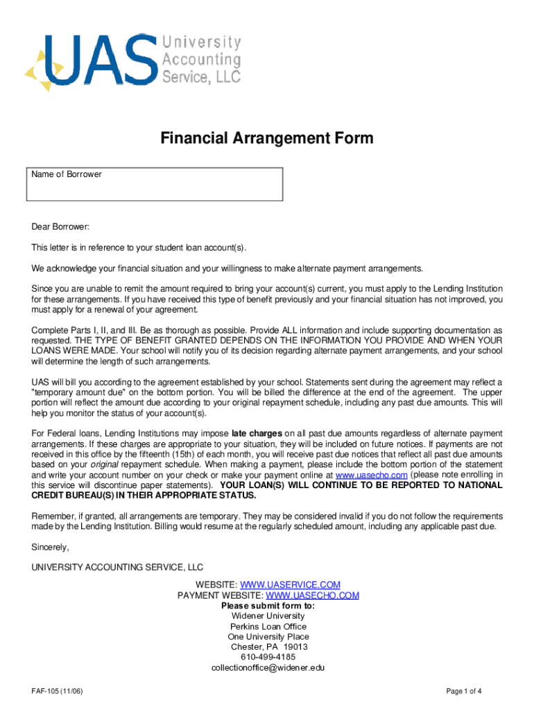 Financial Arrangement Form Name of BorrowerDear Borrower: This letter is in reference to your student loan account(s). We acknowledge your financial situation and your willingness to make alternate