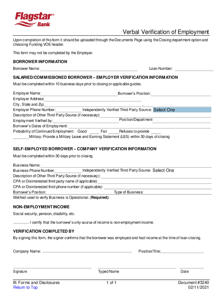 Verbal Verification of Employment Upon completion of this form it should be uploaded through the Documents Page using the Closing department option and choosing Funding VOTE header. This form may
