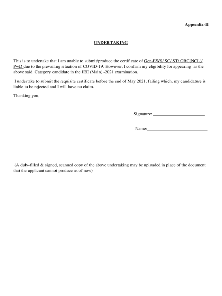 AppendixIIUNDERTAKINGThis is to undertake that I am unable to submit/produce the certificate of Genes/ SC/ ST/ OBC(NCL)/ PhD due to the prevailing situation of COVID-19. However, I confirm my eligibility