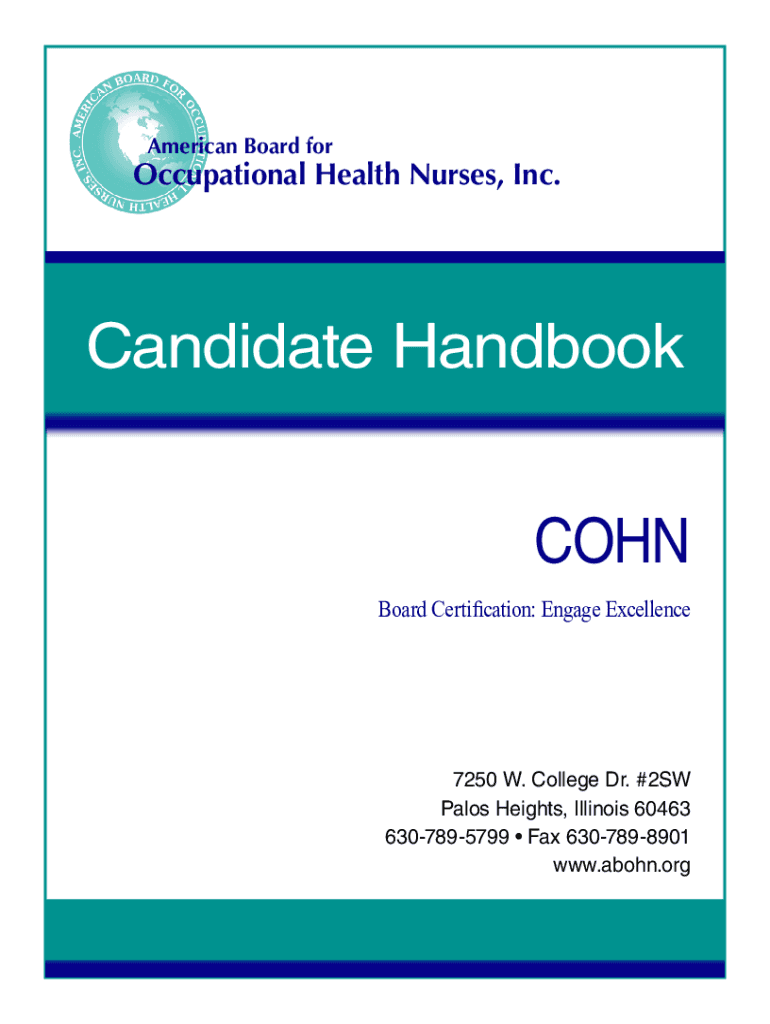 American Board nonoccupational Health Nurses, Inc. Candidate Handbook COHN Board Certification: Engage Excellence7250 W. College Dr. #2SW Palms Heights, Illinois 60463 6307895799 Fax 6307898901 www.abohn.orgMissed