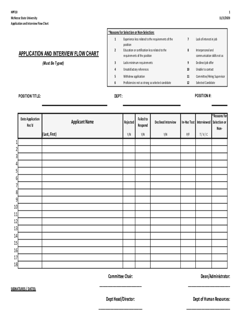 HPF10 Cheese State University Application and Interview Flow Chart1 11/3/2020×Reasons for Selection or Selection: 1APPLICATION AND INTERVIEW FLOW CHART (Must Be Typed)POSITION TITLE:2Experience less