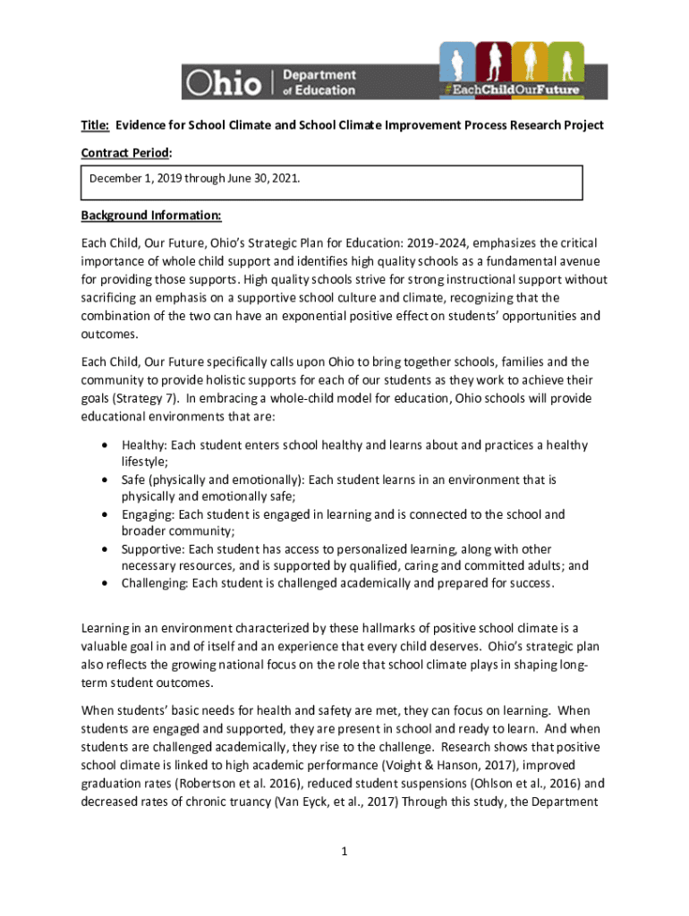 Title: Evidence for School Climate and School Climate Improvement Process Research Project Contract Period: December 1, 2019, through June 30, 2021. Background Information: Each Child, Our Future,