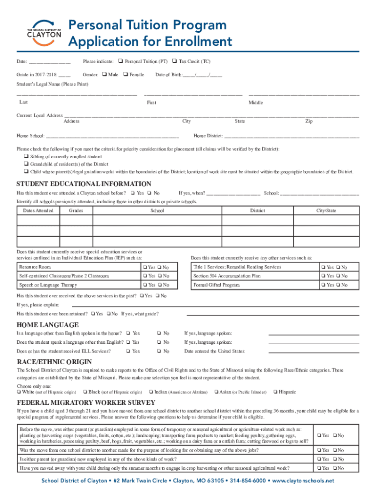 Personal Tuition Program Application for Enrollment Date: Please indicate:Grade in 20172018: Gender:o Personal Tuition (PT) o Tax Credit (TC)o Male o Revalidate of Birth: / / Students Legal Name (Please