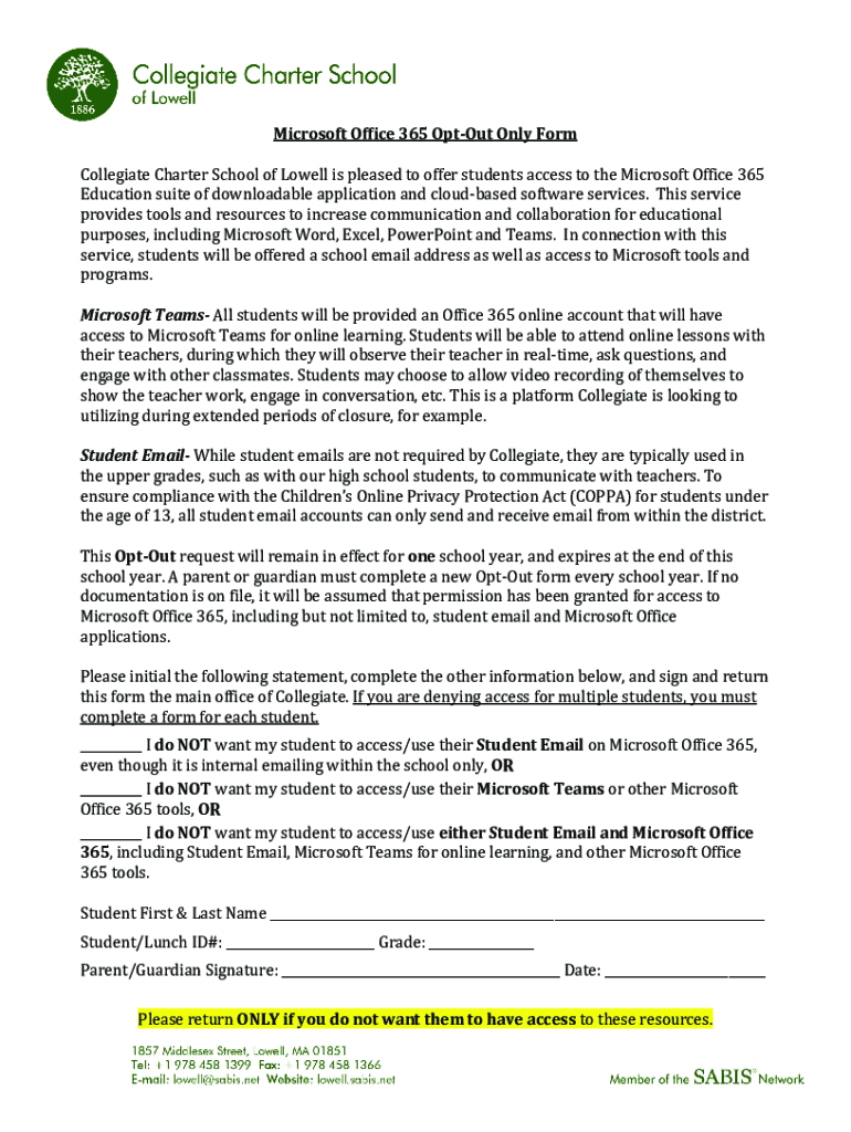 Microsoft Office 365 Opt-out Only Form Collegiate Charter School of Lowell is pleased to offer students access to the Microsoft Office 365 Education suite of downloadable application and cloud based