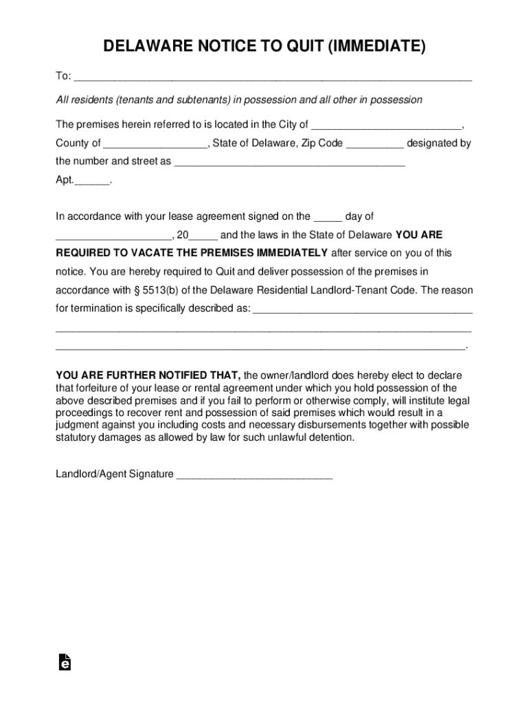 DELAWARE NOTICE TO QUIT (IMMEDIATE) To: All residents (tenants and subtenants) in possession and all other in possession The premises herein referred to is located in the City of, County of, State