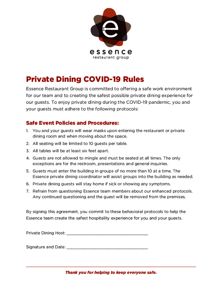 Private Dining COVID-19 Rules Essence Restaurant Group is committed to offering a safe work environment for our team and to creating the safest possible private dining experience for our guests. To