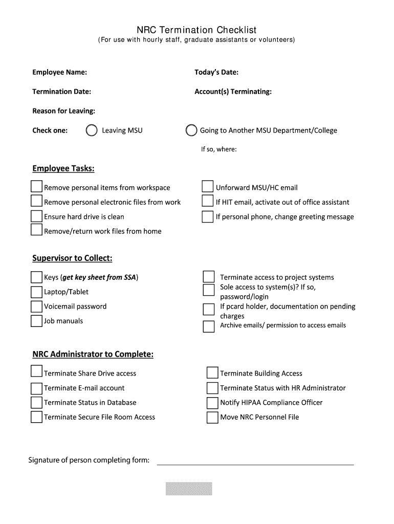 NRC Termination Checklist. (For use with hourly staff, ... Termination Date: Account(s) Terminating: ... Going to Another MSU Department/College. If so, where:.