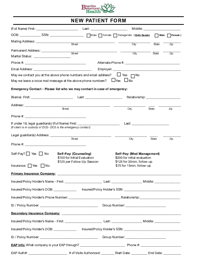 NEW PATIENT FORM (Full Name) First: Last: DOB: SSN: MaleFemaleMiddle: Transgender (Birth GenderMailing Address: StreetFemale)Male Impermanent Address: StreetCityMarital Status: StateStateZipZipPhone