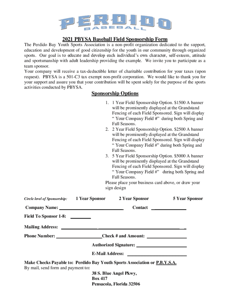 2021 PAYS Baseball Field Sponsorship Form The Per dido Bay Youth Sports Association is a nonprofit organization dedicated to the support, education and development of good citizenship for the youth