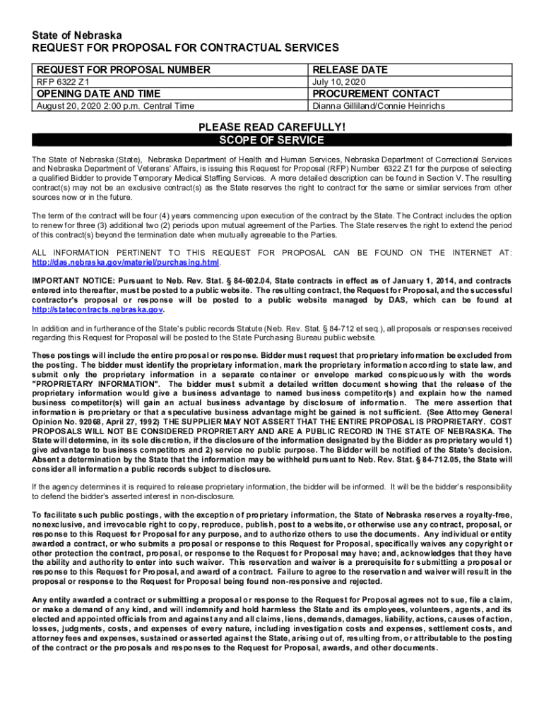 State of Nebraska REQUEST FOR PROPOSAL FOR CONTRACTUAL SERVICES REQUEST FOR PROPOSAL NUMBERRELEASE DATE RFP 6322 Z1July 10, 2020OPENING DATE AND TIMEPROCUREMENT CONTACT August 20, 2020 2:00 p.m. Central