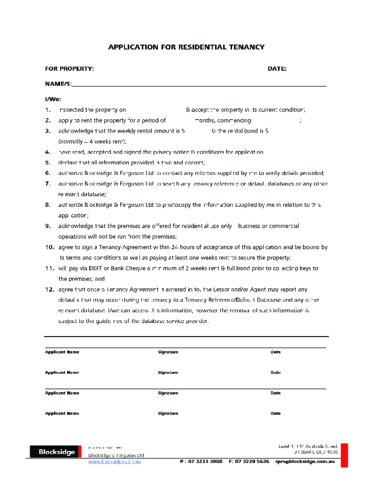 Accredited AgencyApplication for Residential Tenancy (One application to be completed per person)PART 1: RENTAL PROPERTY DETAILS ITEM 1:AGENT DETAILS AGENCY NAME:Blockade & Ferguson Limited ADDRESS: