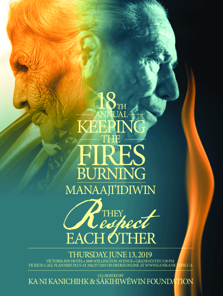 18THANNUALKEEPING THEIRS BURNINGMANAAJIIDIWINR respect TEACH OTHER THURSDAY, JUNE 13, 2019VICTORIA INN HOTEL 1808 WELLINGTON AVENUE GRAND ENTRY: 5:30 PM TICKETS: CALL PLANNERS PLUS AT 204.257.5205