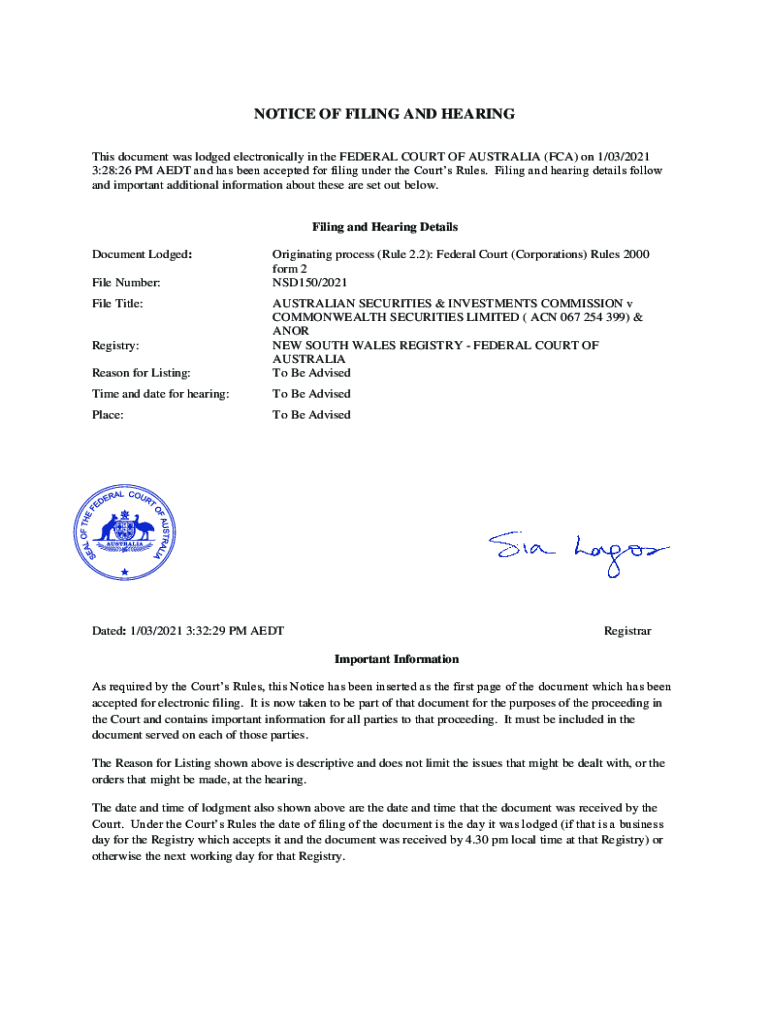 NOTICE OF FILING AND HEARING This document was lodged electronically in the FEDERAL COURT OF AUSTRALIA (FCA) on 1/03/2021 3:28:26 PM ADT and has been accepted for filing under the Courts Rules. Filing