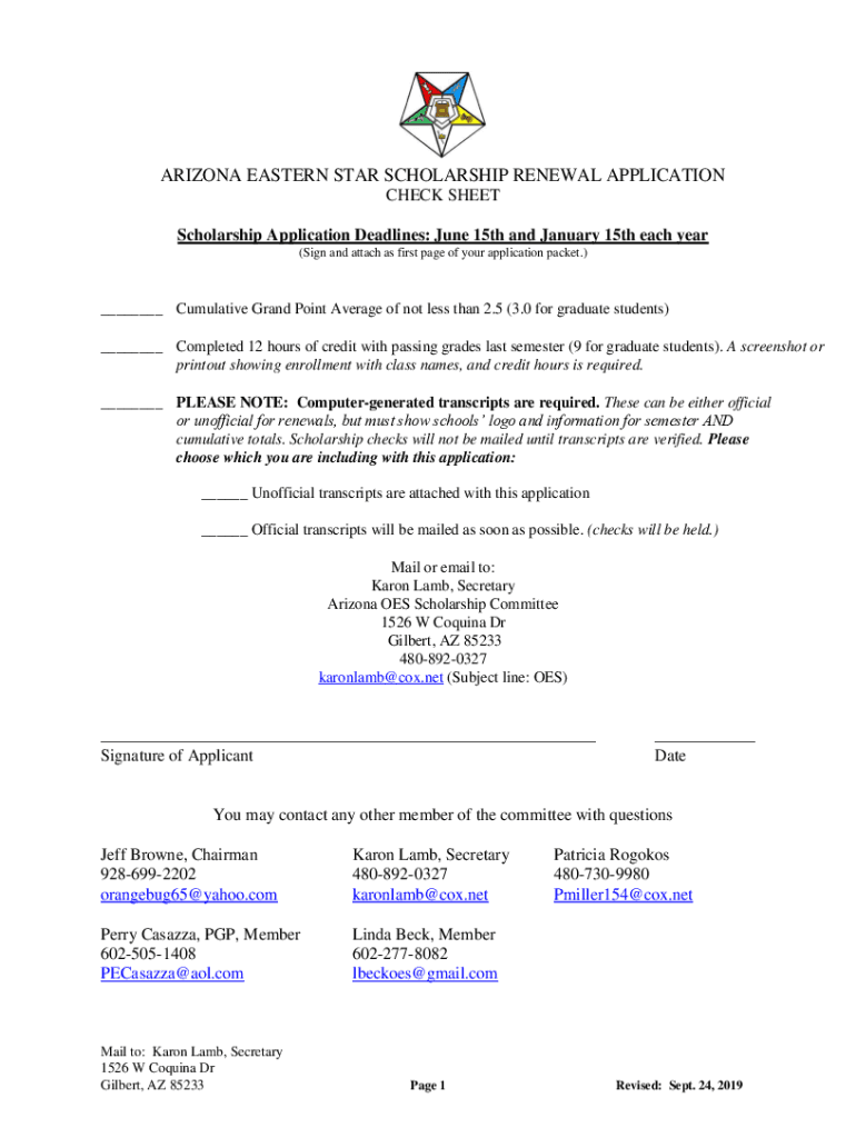 ARIZONA EASTERN STAR SCHOLARSHIP RENEWAL APPLICATION CHECK SHEET Scholarship Application Deadlines: June 15th and January 15th each year (Sign and attach as first page of your application packet.)