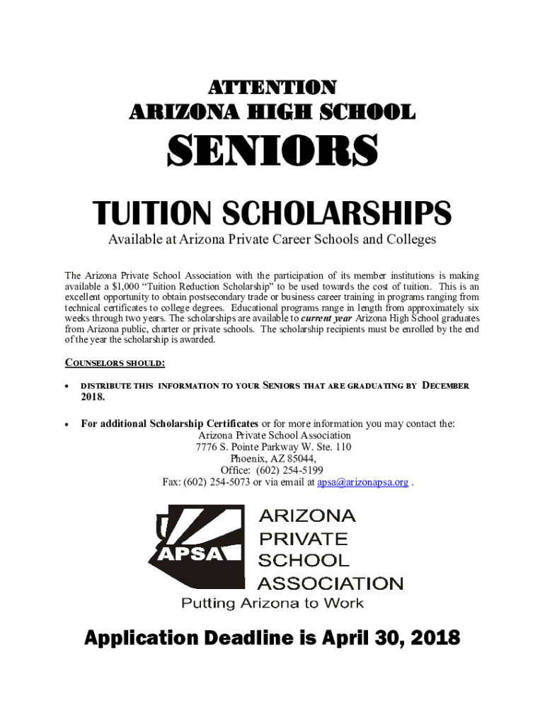 ATTENTIONARIZONA HIGH SCHOOLSENIORS TUITION SCHOLARSHIPS Available at Arizona Private Career Schools and Colleges The Arizona Private School Association with the participation of its member institutions