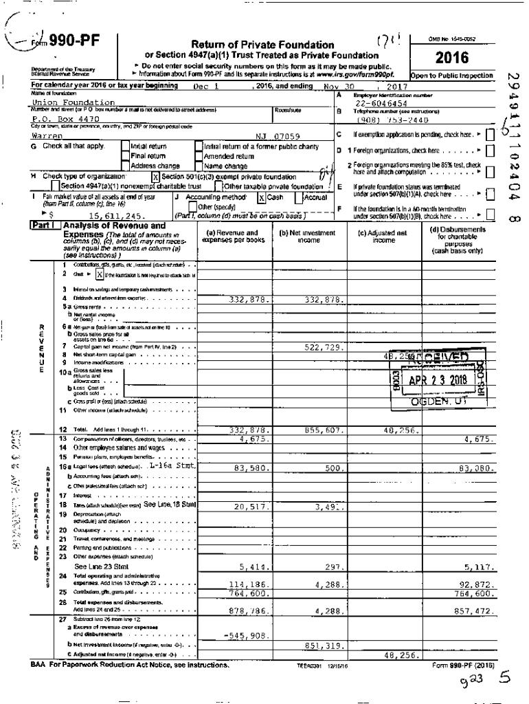 990PFc7 (“Return of Private Foundation OMB No 15450052or Section 4947(a)(1) Trust Treated as Private Foundation enrial Revenue ServiceNow calendar y ear 2016 or tax y ear beginning, 2016, and ending