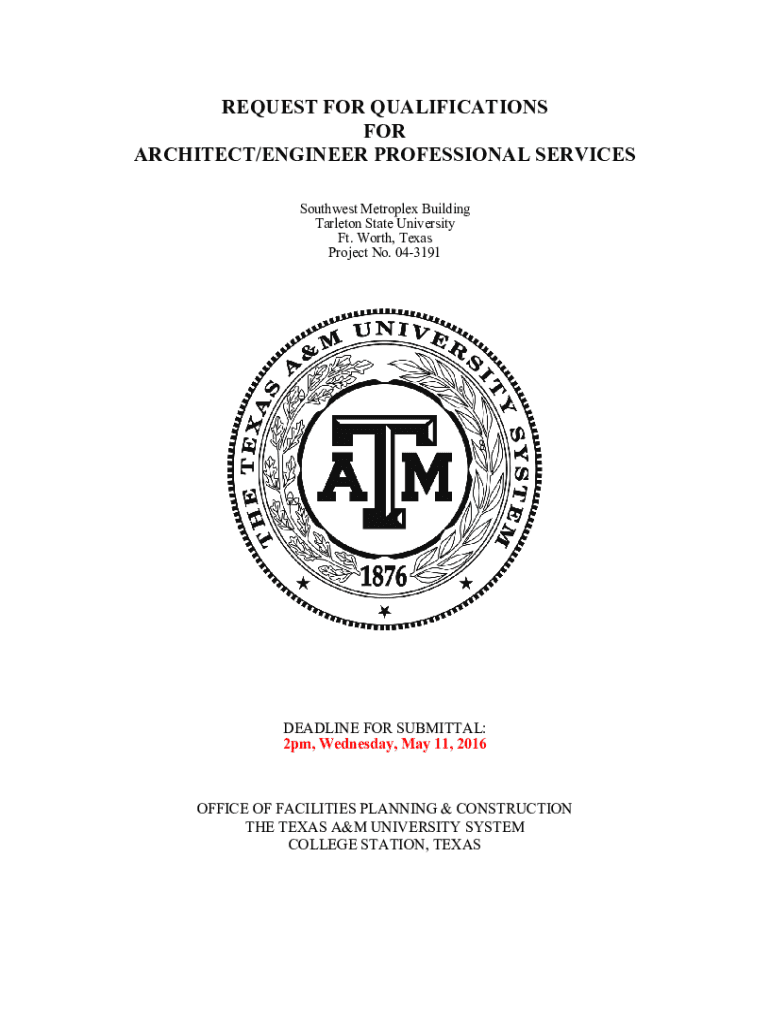 REQUEST FOR QUALIFICATIONS FOR ARCHITECT/ENGINEER PROFESSIONAL SERVICES Southwest Retroflex Building Carleton State University Ft. Worth, Texas Project No. 043191DEADLINE FOR SUBMITTAL: 2pm, Wednesday,