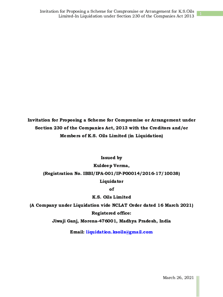 Invitation for Proposing a Scheme for Compromise or Arrangement for K.S. Oils Limited In Liquidation under Section 230 of the Companies Act 2013Invitation for Proposing a Scheme for Compromise or
