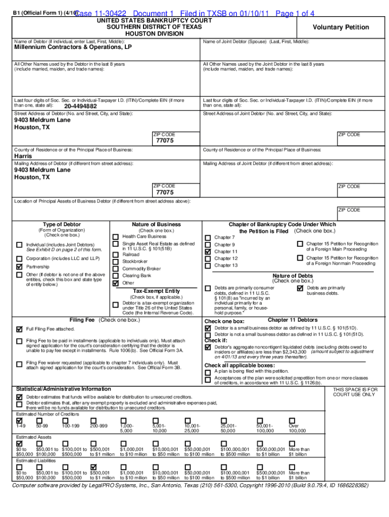 B1 (Official Form 1) (4/10) Case1130422 Document 1 Filed in TSB on 01/10/11-Page 1 of 4 UNITED STATES BANKRUPTCY COURT SOUTHERN DISTRICT OF TEXAS HOUSTON Divisional of Debtor (if individual, enter