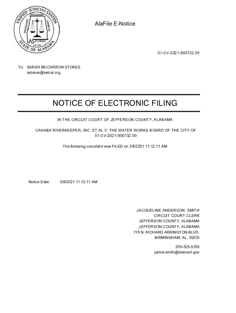 Labile ENotice01CV2021900732.00 To: SARAH MACAROON STOKES sstokes@selcal.orgNOTICE OF ELECTRONIC FILING IN THE CIRCUIT COURT OF JEFFERSON COUNTY, ALABAMA CASABA TIMEKEEPER, INC. ET AL. V. THE WATER
