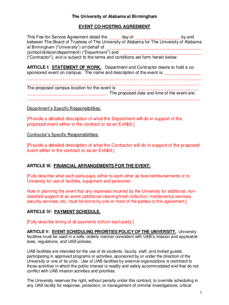 The University of Alabama at Birmingham EVENT COHOSTING AGREEMENT This FeeforService Agreement dated the day of, by and between The Board of Trustees of The University of Alabama for The University