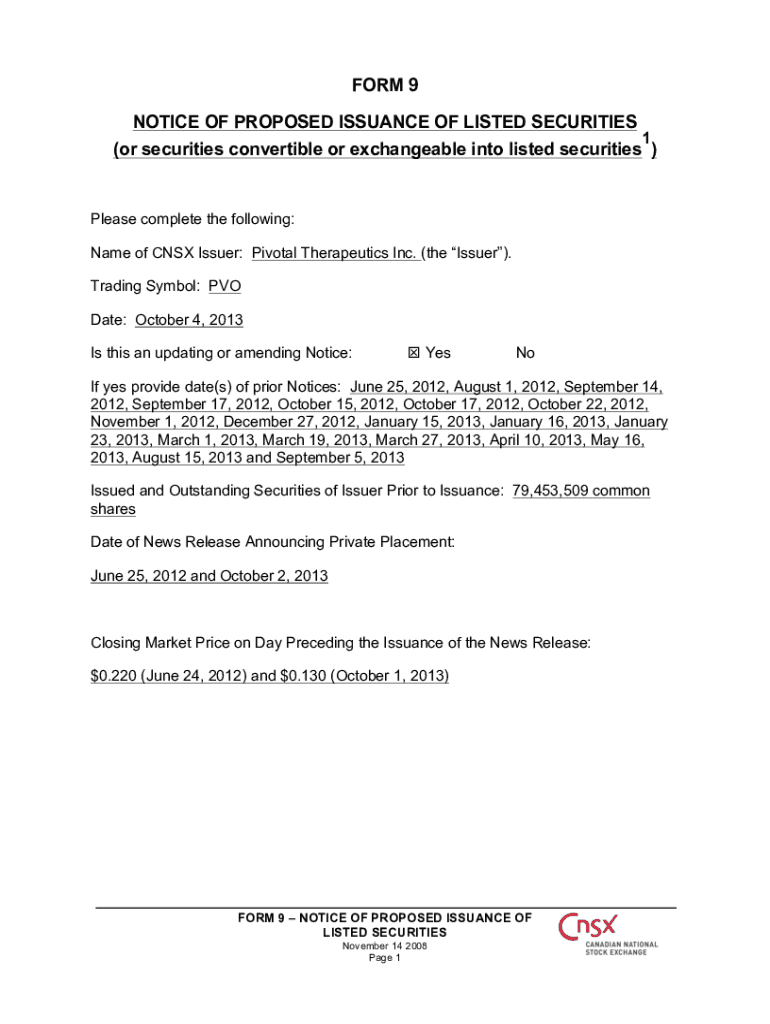 FORM 9 NOTICE OF PROPOSED ISSUANCE OF LISTED SECURITIES1(or securities convertible or exchangeable into listed securities)Please complete the following: Name of CNS Issuer: Pivotal Therapeutics Inc.